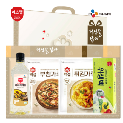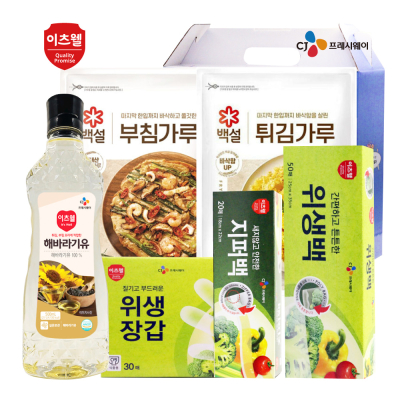 - 구성 : CJ해바라기유500m, CJ부침가루500g, CJ튀김가루500g, CJ위생백(25*35cm) 50매