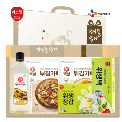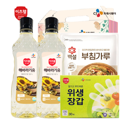 - 구성 : CJ해바라기유500m, CJ부침가루500g, CJ튀김가루500g, CJ위생백(25*35cm) 50매, CJ위생장갑(23.5*27cm) 30매