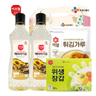 - 구성 : CJ해바라기유500m * 2개, CJ튀김가루500g, CJ위생장갑(23.5*27cm) 30매