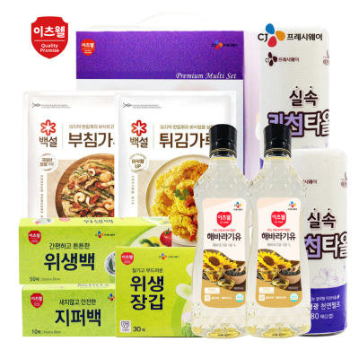 - 구성 : CJ해바라기유500ml * 2개, CJ부침가루500g, CJ튀김가루500g, CJ위생백(25*35cm) 50매, CJ위생장갑(23.5*27cm) 30매, CJ지퍼백(25*30cm) 10매, CJ키친타올(228*114mm) 80매 * 2개