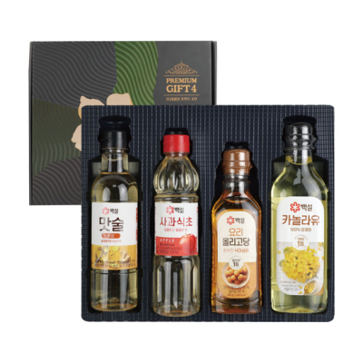 - 구성 : 맛술500ml * 1p, 사과식초500ml * 1p, 카놀라유500ml * 1p, 올리고당 500g * 1p