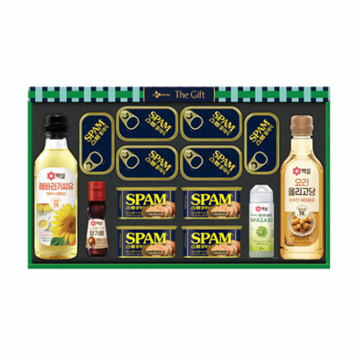 스팸 클래식 200g * 4p, 스팸 클래식 120g * 6p, 백설 해바라기씨유 500ml * 1p, 백설 요리올리고당 700g * 1p, 백설 고소함가득 참기름 80ml * 1p, 백설 찍어먹는 와사비 솔트 50g * 1p, 쇼핑백, 499mm * 353mm * 58mm