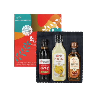 - 구성 : 백설 카놀라유500ml * 1p, 백설 올리고당500g * 1p, 청정원 진간장500ml * 1p
