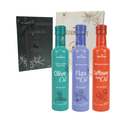 - 구성 : 엑스트라버진 올리브유 250ml, 아마씨유 250ml, 홍화씨유 250ml