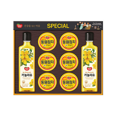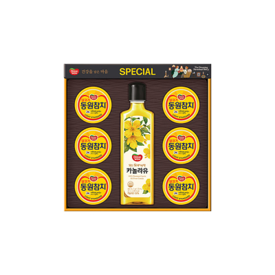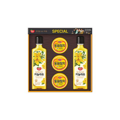 라이트스탠다드참치 90g * 5캔, 동원 카놀라유 480ml * 2병, 재래식압착참기름 160ml * 1병, 동원 참치액 240g * 1병, 동원 구운소금 210g * 1병, 부직포 가방, 442mm * 323mm * 63mm