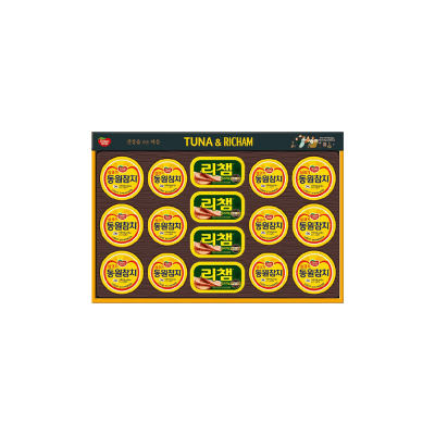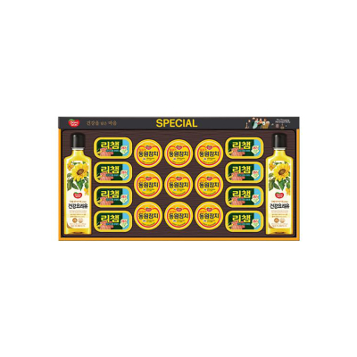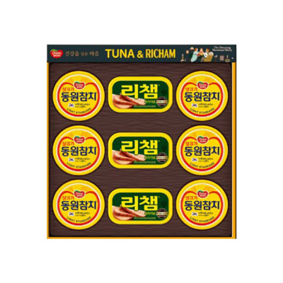 라이트스탠다드참치 90g * 6캔, 리챔 오리지널 120g * 2캔, 동원 참치액(순) 500g * 1병, 동원 히말라야 핑크솔트 100g * 1개, 재래식 압착참기름 75ml * 1병, 동원 사과식초 500ml * 1병, 동원 올리고당 700g * 1병, 동원 카놀라유 480ml * 2병, 부직포 가방, 522mm * 405mm * 67mm