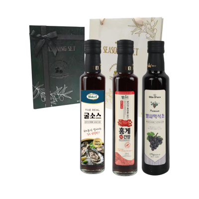 - 구성 : 굴소스(유리병)250ml * 1p, 홍게간장(유리병)250ml * 1p, 발사믹식초(유리병)250ml * 1p