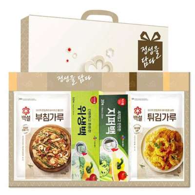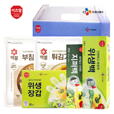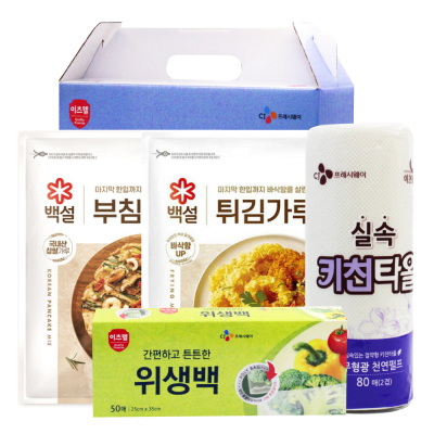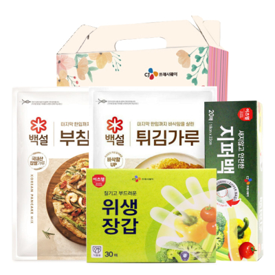 - 구성 : CJ부침가루500g, CJ위생장갑(23.5*27cm) 30매, CJ위생백(25*35cm) 50매, CJ지퍼백(18*22cm) 20매, CJ키친타올 80매