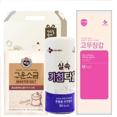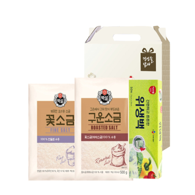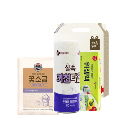 - 구성 : CJ꽃소금500g, CJ위생백(25*35cm) 50매, CJ키친타올(228*114mm) 80매