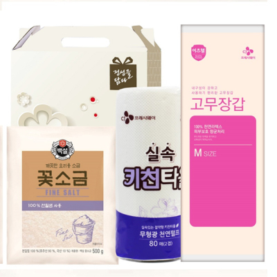 - 구성 : CJ꽃소금500g, CJ고무장갑(M사이즈), CJ키친타올(228*114mm) 80매