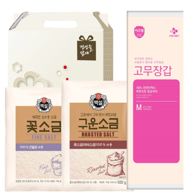 - 구성 : CJ구운소금500g, CJ꽃소금500g, CJ고무장갑(M사이즈)