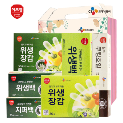 - 구성 : CJ위생백(17*25cm) 100매, CJ위생백(25*35cm) 50매, CJ지퍼백(18*22cm) 20매, CJ위생장갑(23.5*27cm) 50매, CJ위생장갑(23.5*27cm) 30매, 쿠킹호일(25cm*15m)