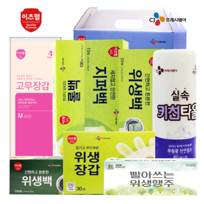 - 구성 : CJ위생백(25*35cm) 50매, CJ위생백(17*25cm) 100매, CJ지퍼백(25*30cm) 10매, CJ위생장갑(23.5*27cm) 30매, CJ케이스롤백(25*35cm) 100매, CJ고무장갑(M사이즈), CJ키친타올(228*114mm) 80매, 빨아쓰는 위생행주(300mm*300mm) 5매