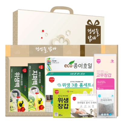 - 구성 : 각티슈(215*200mm/2겹) 180매, 위생3종홈세트(위생백25*35cm-40매,위생장갑23.5*27cm-20매,지퍼백25*30cm-5매), 롤키친타올(228*114)80매*3개