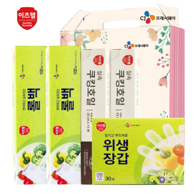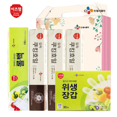 - 구성 : CJ케이스롤백(25*35cm) 100매, CJ위생장갑(23.5*27cm) 30매, 쿠킹호일(25cm*15m) * 3p