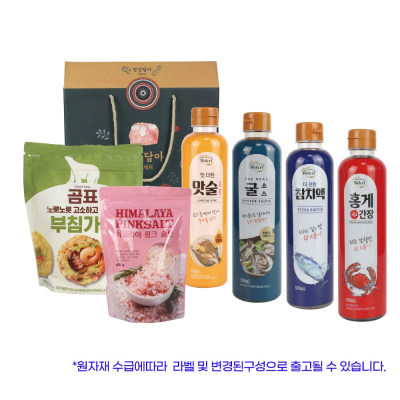 - 구성 : 맛술(pet) 500ml * 1p, 참치액(pet) 500ml * 1p, 굴소스(pet) 500ml * 1p, 홍게간장(pet) 500ml * 1p, 히말라야핑크솔트 400g * 1p, 부침가루 500g * 1p