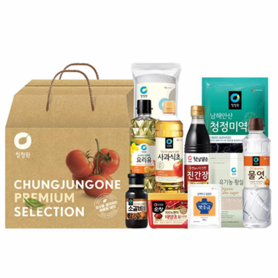 진간장골드 500ml * 1p, 요리유 500ml * 1p, 사과식초 500ml * 1p, 생강매실 맛술 410ml * 1p, 소갈비양념 280g * 1p, 민속당면 300g * 1p, 청정미역 25g * 1p, 유기농황설탕 454g * 1p, 찰고추장 500g * 1p, 맛소금 250g * 1p, 키친타올 * 1p, 물엿 700g * 1p, 끈 손잡이 케이스, 340mm * 195mm * 335mm