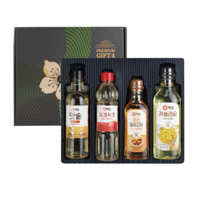 맛술 500ml * 1p, 사과식초 500ml * 1p, 백설카놀라유 500ml * 1p, 올리고당 500g * 1p, 끈 손잡이 케이스, 380mm * 300mm * 70mm