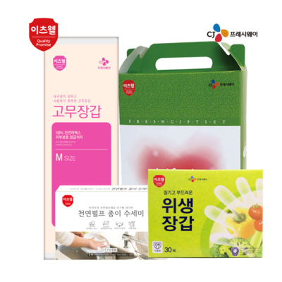 - 구성 : CJ위생장갑(23.5*27cm) 30매, CJ고무장갑(M사이즈, 친환경건식수세미(200*300mm) 5매