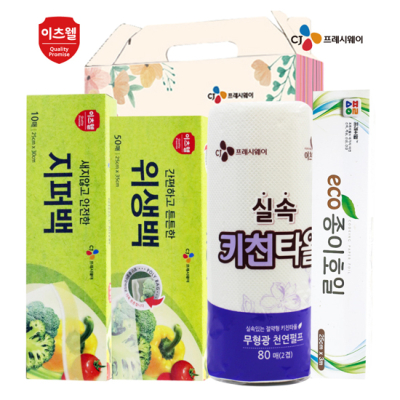 - 구성 : CJ위생백(25*35cm) 50매, CJ지퍼백(25*30cm) 10매, CJ키친타올(228*114mm) 80매, 종이호일(25cm*3M)