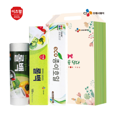 - 구성 : CJ위생백(25*35cm) 50매, CJ지퍼백(25*30cm) 10매, CJ케이스롤백(25*35cm) 100매, 친환경건식수세미(200*300mm) 5매