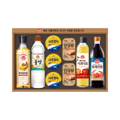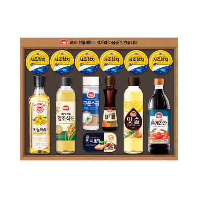 잇츠팜 115g * 2p, 진간장골드 200ml * 2p, 해바라기유 500ml * 1p, 요리올리고당 700g * 1p, 천일염가는소금 190g * 1p, 정통사과식초 470ml * 1p, 소갈비양념 280g * 1p, 쇼핑백, 480mm * 303mm * 65mm