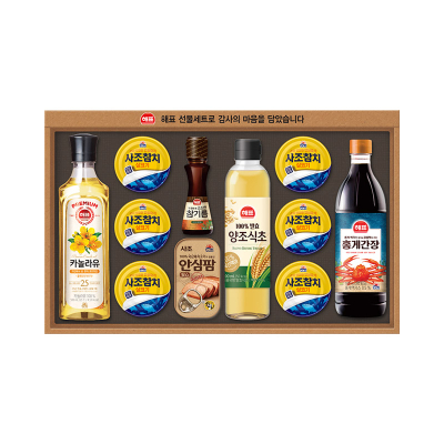순살참치 75g * 2p, 진간장골드 200ml * 2p, 카놀라유 500ml * 1p, 요리올리고당 700g * 1p, 현미식초 500ml * 1p, 생강매실 맛술 410ml * 1p, 끈 손잡이 케이스, 466mm * 291mm * 71mm