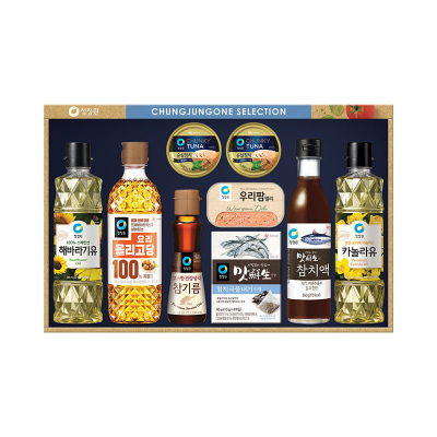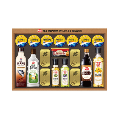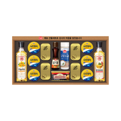카놀라유 500ml * 1p, 사과식초 500ml * 1p, 살코기참치 85g * 6p, 쟌슨빌클래식 200g * 1p, 토판소금 200g * 1p, 고소한참기름 110ml * 1p, 맛술 500ml * 1p, 양조간장 500ml * 1p, 부직포 쇼핑백, 563mm * 302mm * 63mm