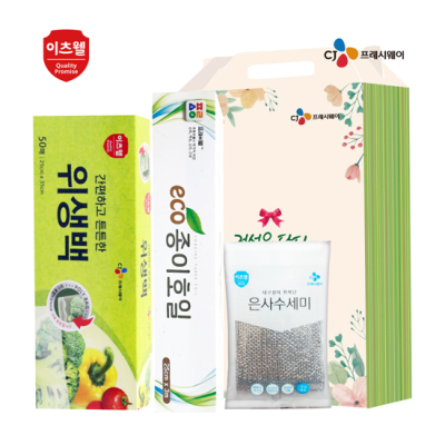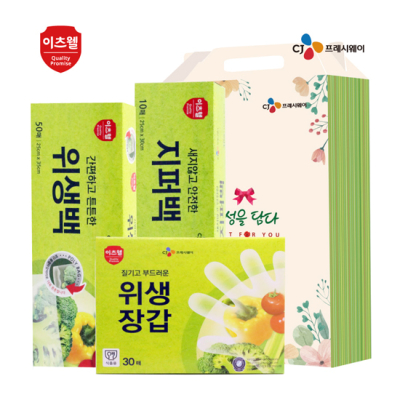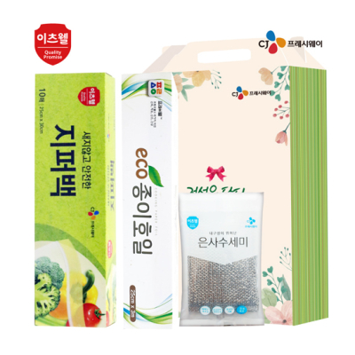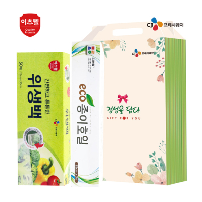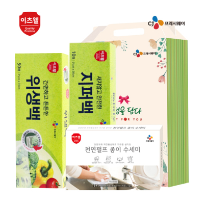 - 구성 : CJ위생백(25*35cm) 50매, CJ지퍼백(25*30cm) 10매, 친환경건식수세미(200*300mm) 5매