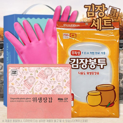 - 구성 : 김장봉투 4매, 온누리 위생팩 70매, 온누리 목이 긴 장갑 10매, E로운 고무장갑 L사이즈, 김장용 앞치마 2개