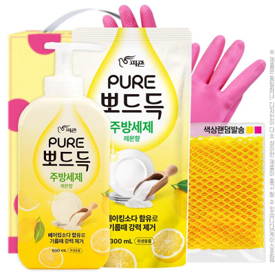 뽀드득주방세제500ml(펌프),뽀드득주방세제300ml(리필),(비닐)고무장갑32cm,망사수세미(옐로우,핑크 랜덤발송)