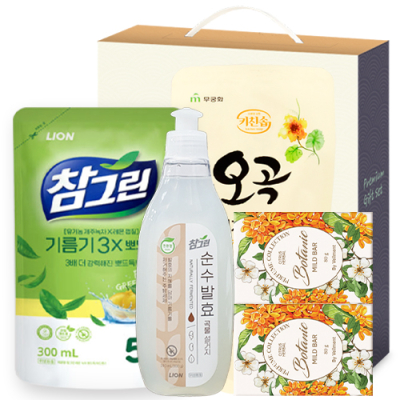 • [G]LION 참그린 순수발효 곡물 주방세제 용기 300g + 참그린 레몬녹차 뽀드득 리필 300ml + 무궁화 오곡 안심설거지 리필 300ml + 온더바디 비누 80g x 2개[110-212267]